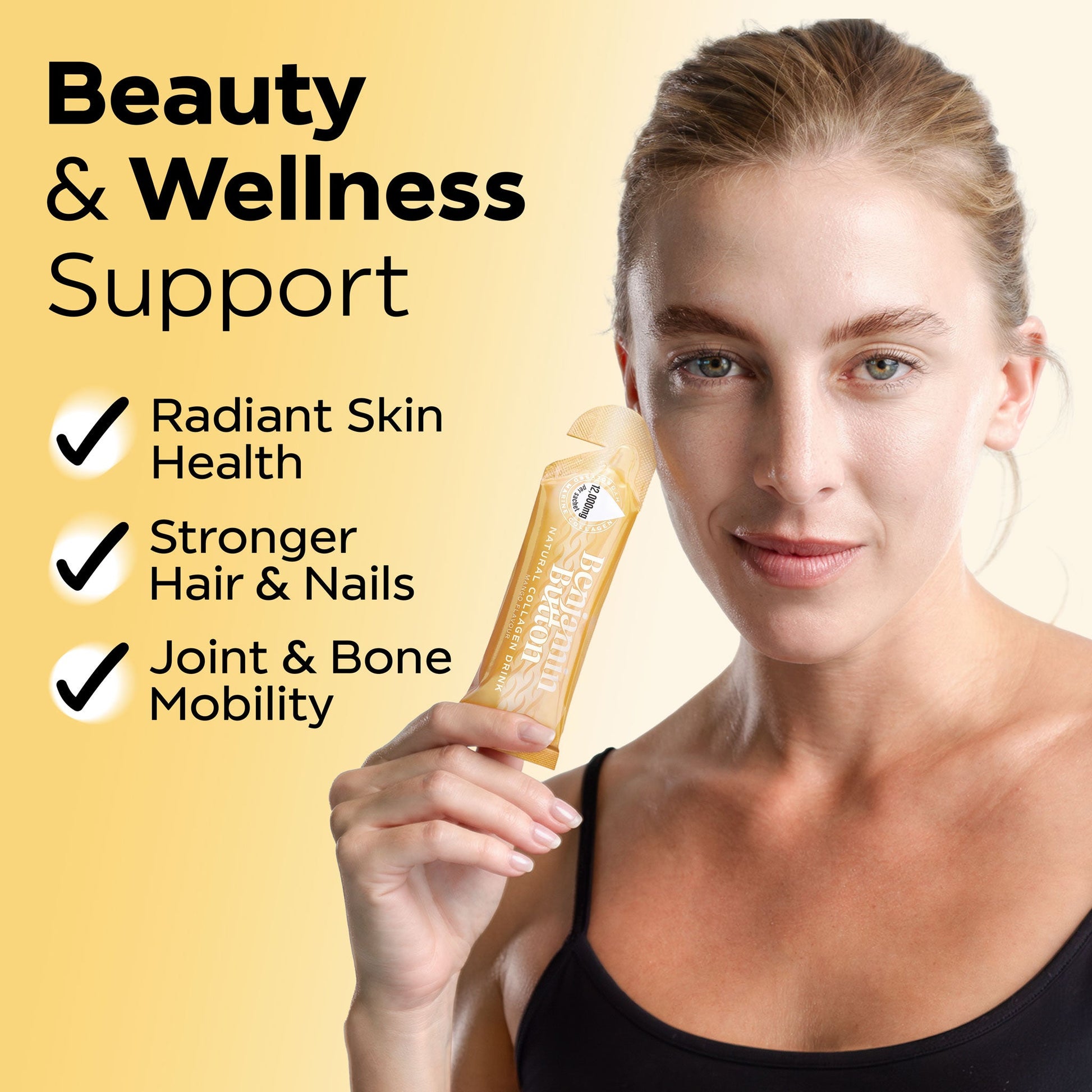 Benjamin Button's 12,000mg Marine Collagen Liquid Sachets in Mango deliver a potent, bioavailable dose of hydrolysed marine collagen peptides in a convenient, ready-to-drink 30ml sachet. Boosted with Vitamin C and Sodium Hyaluronate, this clean, effective formula supports skin, hair, nails, and joints — with a naturally delicious mango flavour and no mixing required.
